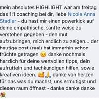 Danke an Nicole Anna Stadler und dein Team für all die wunderbaren Kurse, die ich bei euch besuchen durfte, sie waren soso hilfreich. Ich habe angefangen zu posten, Videos zu drehen und wurde tatsächlich SICHTBAR.