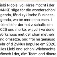 «Es ist als wäre es gestern gewesen. Voller Vorfreude und mit grosser Neugier habe ich mich für den ausgeschriebenen Jahreskurs „Zyklisches Business“ bei dir angemeldet. Dieser Jahreskurs ist nun vorbei und ich blicke dankbar zurück.