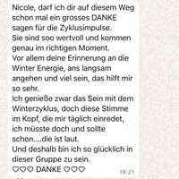 Besonders spricht mich die zyklische Arbeitsweise an, ich habe früher gar nicht gewusst, wie viel mehr Kraft ich habe, wenn ich in meinem Zyklus Dinge tue und nicht nach einem Plan, der von aussen kommt. Ich kann es jedem nur empfehlen auch dabei zu sein.